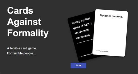 Web our intrepid team of poop joke scientists is hard at work cooking up new cards for you to laugh at. Web our intrepid team of poop joke scientists is hard at work cooking up new cards for you to laugh at. You can help us test out new cards at the official cards against humanity lab. Web cards against formality is a party card game based on cards against humanity. You can also play online at pretend. The game is free to play and always will. Play online with your friends. The two are not affiliated with each other in any way. Help us update the game and test out material for new expansions by. Web can i play cards against humanity online anywhere? Create a private game and share the game code.