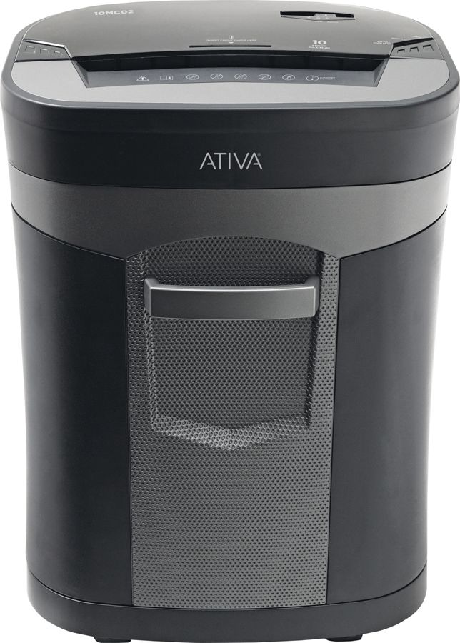 Ativa 10 Sheet Micro Cut Shredder - Shreds paper, staples and credit cards. Web integrated features that help you save time when shredding documents.