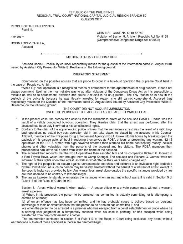 Motion to Quash Sample Search Warrant Arrest