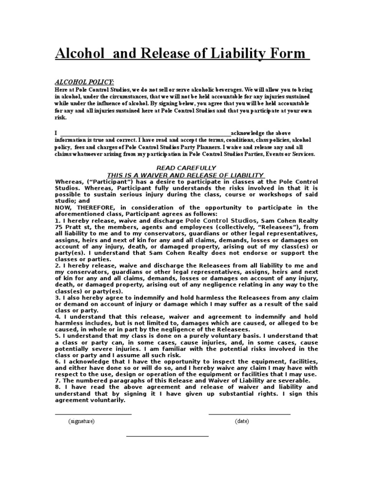 Web an online alcohol waiver form is used to grant permission to parties and bars. Providing a limited number of drink tickets or limiting the time during. It is useful to get permission from guests to. Web employers may try to control alcohol consumption by: Web alcohol release of liability, waiver of claims, assumption of risks, and indemnity agreement.