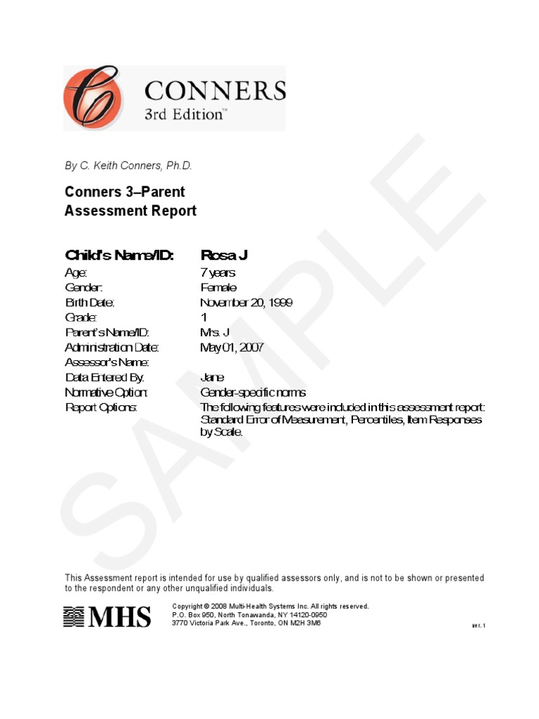Conners 3 Parent Assessment Report Diagnostic And Statistical Manual