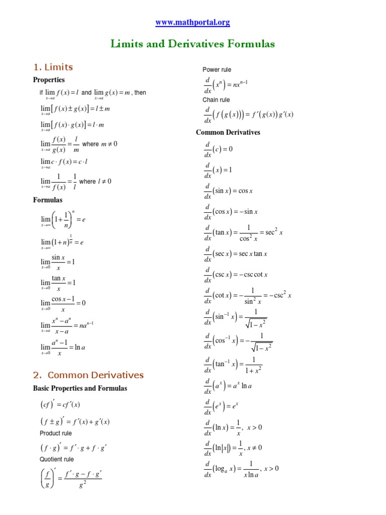 Formulasheetderivatives compress Derivative Formulas In the