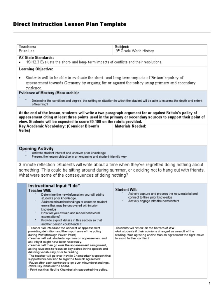 direct instruction lesson plan template wwi Educational Assessment