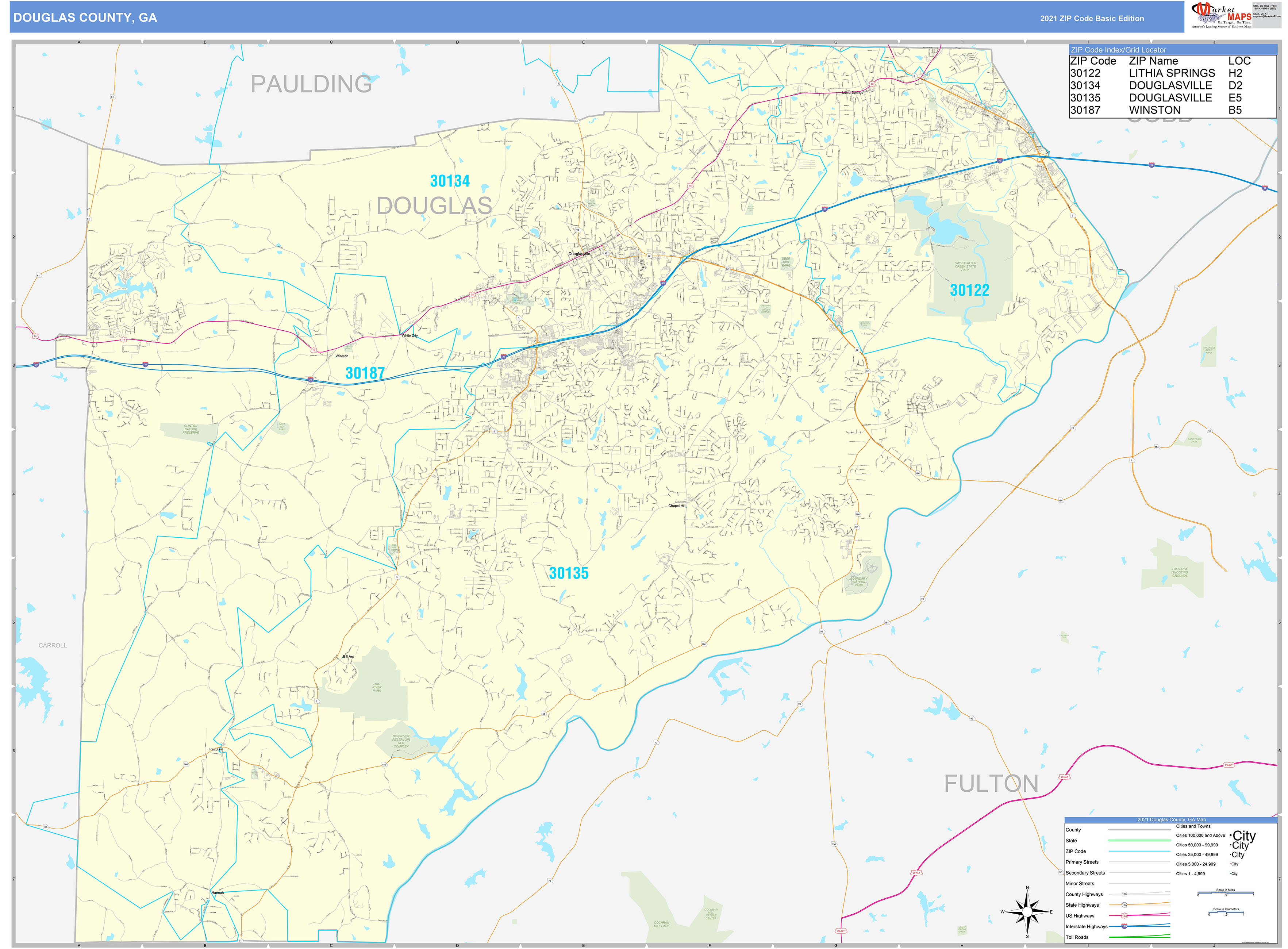 Douglas County, GA Zip Code Wall Map Basic Style by MarketMAPS MapSales