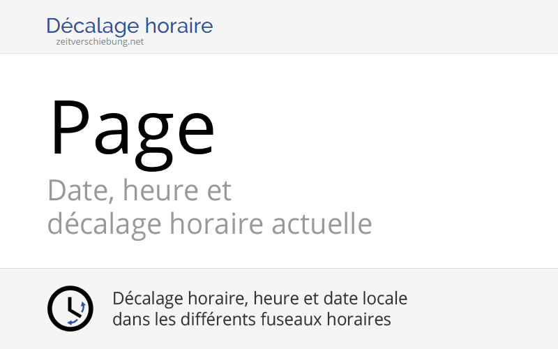Web durée du jour : Web l'heure à page (arizona) décalage horaire, heure actuelle et heure d'été. L'heure locale actuelle à page est 35 minutes en avance sur l'heure du soleil. Le fuseau horaire de page : Quelle est l' heure actuelle à page (arizona) aux états.