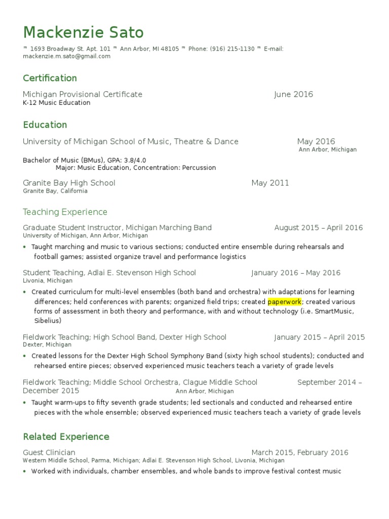 indiana resume Music Education University Of Michigan