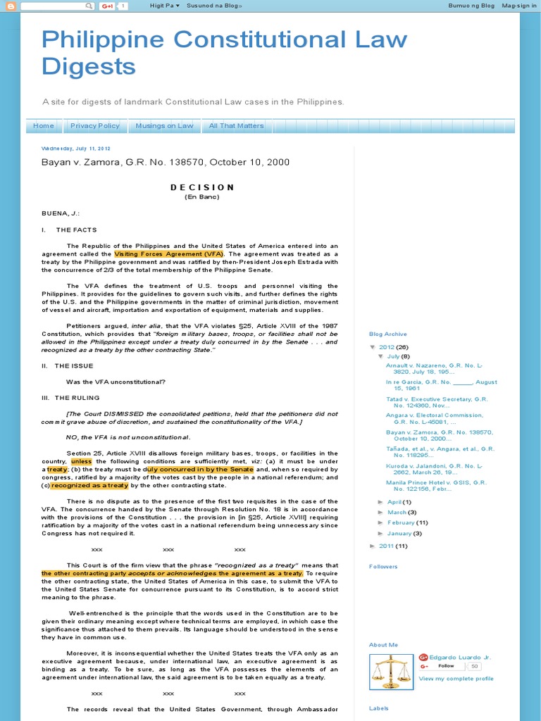 Bayan v. Zamora, G.R. No. 138570, October 10, 2000 Ratification Treaty