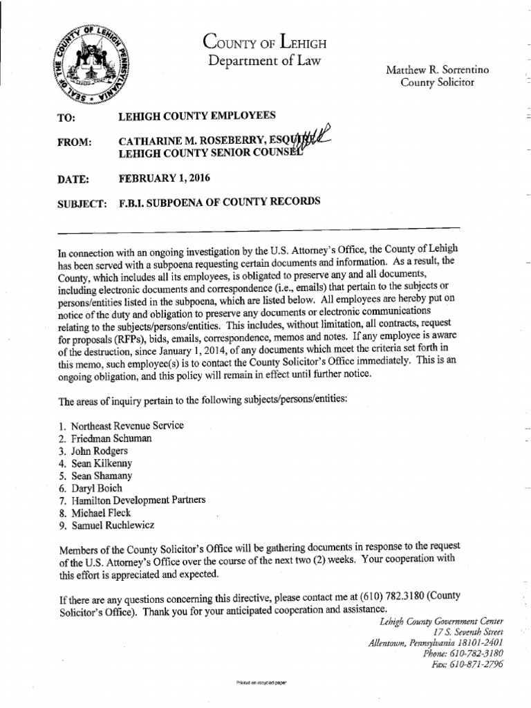 Lehigh County Employee Document Retention Letter