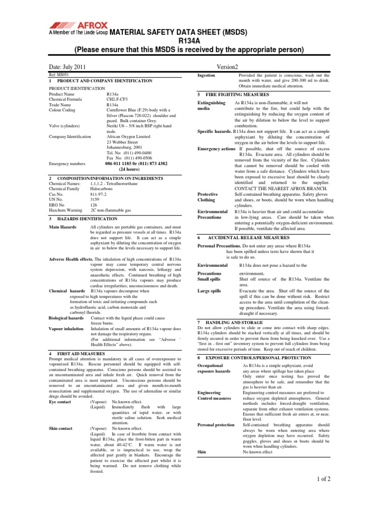 Material Safety Data Sheet (Msds) R134A (Please ensure that this MSDS