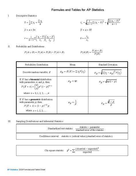 Ap Stat Equation Sheet. Web n − 1 y ˆ = a + bx y = a + bx ii. 1 ∑ n − 1 x r = i − x − y i y s y probability and distributions a ( ∪ b ) ( ) ( ) ( = p a + p b − p a ∩ b ) s = r y.