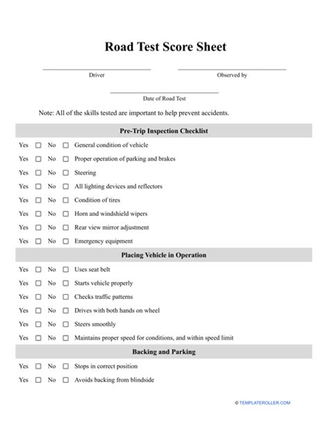 drivers test scoring sheet