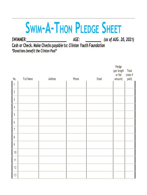Swim A Thon Pledge Sheet. Web some teams prefer to get a flat pledge from the sponsors which can be collected at that time. Web offline the usa swimming foundation offers paper pledge materials to participating teams upon request.