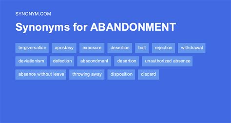 Web what is another word for abandonment? Web words related to abandonment are not direct synonyms, but are associated with the word abandonment. Web what is another word for abandonment? Abandon, naturalness, zeal, enthusiasm, spontaneity, warmth, unrestraint, ease; Indulge, surrender, yield, give up, deliver, overdo, revel, bask; Contexts the action or fact of abandoning or being abandoned the action or fact of.