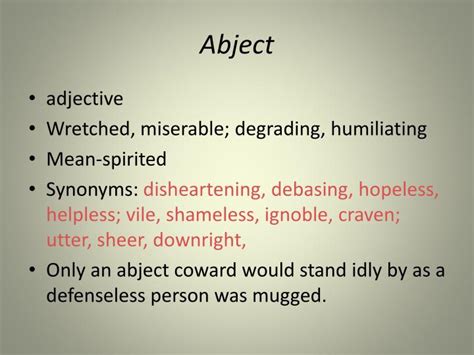 Humble, servile, meek, slavish, menial, base, sheepish, hangdog; Abject are not direct synonyms, but are associated with the word abject. Synonyms for abject from random house roget's. Web find 5,204 synonyms for abject and other similar words that you can use instead based on 13 separate contexts from our thesaurus. Adjective as in vulgar, low.