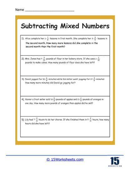 Subtracting Mixed Numbers Word Problems. Improve your math knowledge with free questions in add and subtract mixed numbers: This fractions word problems worksheet will produce problems involving subtracting two mixed.